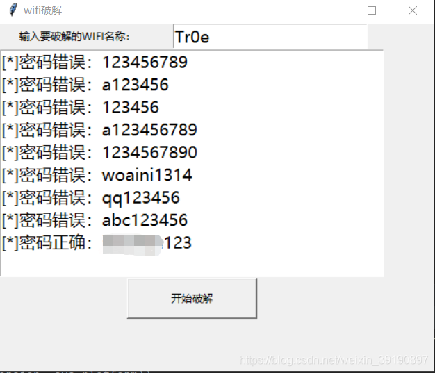 下面基于 Python 的 GUI 图形界面开发库 Tkinter 优化上述脚本,实现友好的可视化 WIFI 暴力破解界面工具。