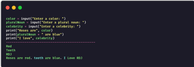 提示:以用户输入的名词、代词、形容词等作为输入,然后将所有数据添加到句子中,并将其组合返回。