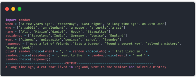 提示:random模块可以用来选择故事的随机部分,内容来自每个列表里。