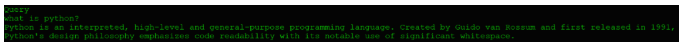 from bs4 import BeautifulSoup import requests headers = {'User-Agent': 'Mozilla/5.0 (Windows NT 10.0; Win64; x64) AppleWebKit/537.36 (KHTML, like Gecko) Chrome/58.0.3029.110 Safari/537.3'} def google(query): query = query.replace(" ","+") try: url = f'https://www.google.com/search?q={query}&oq={query}&aqs=chrome..69i57j46j69i59j35i39j0j46j0l2.4948j0j7&sourceid=chrome&ie=UTF-8' res = requests.get(url,headers=headers) soup = BeautifulSoup(res.text,'html.parser') except: print("Make sure you have a internet connection") try: try: ans = soup.select('.RqBzHd')[0].getText().strip() except: try: title=soup.select('.AZCkJd')[0].getText().strip() try: ans=soup.select('.e24Kjd')[0].getText().strip() except: ans="" ans=f'{title}\n{ans}' except: try: ans=soup.select('.hgKElc')[0].getText().strip() except: ans=soup.select('.kno-rdesc span')[0].getText().strip() except: ans = "can't find on google" return ans result = google(str(input("Query\n"))) print(result)