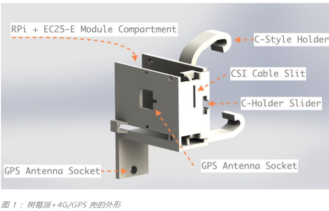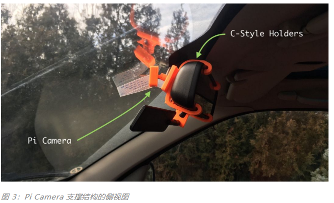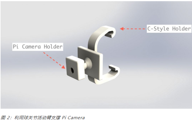 图 1 和图 2 就是它们渲染时候的样子。注意这里的 c 型支架是可插拔的,所以树莓派的附件和 Pi Camera 的支撑物没有和支架一起打印出来。他们共享一个插座,插座上插着支架。如果某位读者想要复现这个项目,这是非常有用的。他们只需要调整后视镜上的支架就可以了。