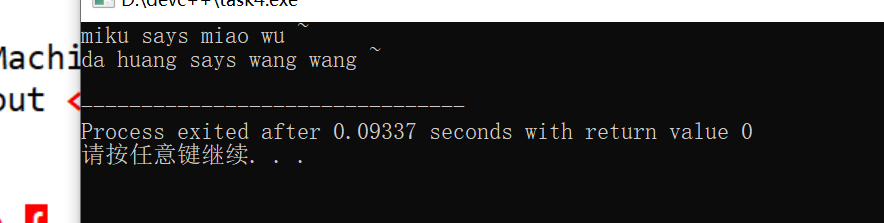 1 #include<iostream> 2 #include<string> 3 using namespace std; 4 class MachinePets{ 5 private: 6 string nickname; 7 public: 8 MachinePets(const string s) 9 { 10 nickname=s; 11 } 12 virtual string talk()=0; 13 string get_nickname() const{ 14 return nickname; 15 } 16 }; 17 class PetCats: public MachinePets{ 18 public: 19 PetCats(const string s):MachinePets(s) 20 {} 21 string talk() 22 { 23 string talk="miao wu ~"; 24 return talk; 25 } 26 }; 27 class PetDogs: public MachinePets{ 28 public: 29 PetDogs(const string s):MachinePets(s) 30 { 31 32 } 33 string talk() 34 { 35 string talk="wang wang ~"; 36 return talk; 37 } 38 };