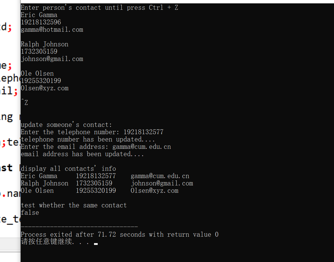 1 #include<iostream> 2 #include<string> 3 #include<iomanip> 4 #include<vector> 5 #include <sstream> 6 void test() { 7 vector<Person> phone_book; 8 Person p; 9 cout << "Enter person's contact until press Ctrl + Z" << endl; 10 while(cin>>p) 11 { 12 phone_book.push_back(p); 13 } 14 cin.clear(); 15 cout << "\nupdate someone's contact: \n"; 16 phone_book.at(0).update_telephone(); 17 phone_book.at(0).update_email(); 18 19 cout << "\ndisplay all contacts' info\n"; 20 for(auto &phone: phone_book) 21 cout << phone << endl; 22 23 cout << "\ntest whether the same contact\n"; 24 cout << boolalpha << (phone_book.at(0) == phone_book.at(1)) << endl; 25 } 26 27 int main() { 28 test(); 29 } 30