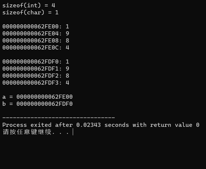 #include <stdio.h> #define N 4 int main() { int a[N] = {1, 9, 8, 4}; char b[N] = {'1', '9', '8', '4'}; int i; printf("sizeof(int) = %d\n", sizeof(int)); printf("sizeof(char) = %d\n", sizeof(char)); printf("\n"); // 输出一维int数组a中每个元素的地址、值 for (i = 0; i < N; ++i) printf("%p: %d\n", &a[i], a[i]); printf("\n"); // 输出一维char数组b中每个元素的地址、值 for (i = 0; i < N; ++i) printf("%p: %c\n", &b[i], b[i]); printf("\n"); // 输出数组名a和b对应的值 printf("a = %p\n", a); printf("b = %p\n", b); return 0; }