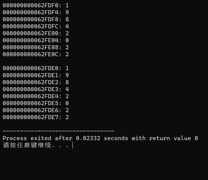 #include <stdio.h> #define N 2 #define M 4 int main() { int a[N][M] = {{1, 9, 8, 4}, {2, 0, 2, 2}}; char b[N][M] = {{'1', '9', '8', '4'}, {'2', '0', '2', '2'}}; int i, j; // 输出二维数组a中每个元素的地址和值 for (i = 0; i < N; ++i) for (j = 0; j < M; ++j) printf("%p: %d\n", &a[i][j], a[i][j]); printf("\n"); // 输出二维数组a中每个元素的地址和值 for (i = 0; i < N; ++i) for (j = 0; j < M; ++j) printf("%p: %c\n", &b[i][j], b[i][j]); return 0; }
