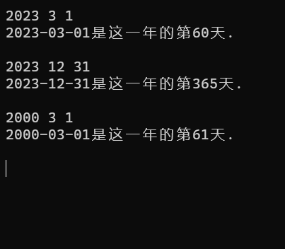 #include <stdio.h> #define N 13 int days_of_year(int year, int month, int day); int main() { int year, month, day; int days; while(scanf("%d%d%d", &year, &month, &day) != EOF) { days = days_of_year(year, month, day); printf("%4d-%02d-%02d是这一年的第%d天.\n\n", year, month, day, days); } return 0; } int days_of_year(int year, int month, int day){ int sum = 0; int i; int a[N]={0,31,29,31,30,31,30,31,31,30,31,30,31}; if(year%4==0&&year%100!=0||year%4==0) a[2]=29; else a[2]=28; for(i=0;i<month;i++) sum+=a[i]; return sum+day; }