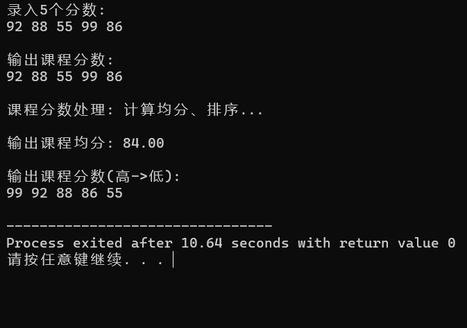 #include <stdio.h> #define N 5 // 函数声明 void input(int x[], int n); void output(int x[], int n); double average(int x[], int n); void bubble_sort(int x[], int n); int main() { int scores[N]; double ave; printf("录入%d个分数:\n", N); input(scores, N); printf("\n输出课程分数: \n"); output(scores, N); printf("\n课程分数处理: 计算均分、排序...\n"); ave = average(scores, N); bubble_sort(scores, N); printf("\n输出课程均分: %.2f\n", ave); printf("\n输出课程分数(高->低):\n"); output(scores, N); return 0; } // 函数定义 // 输入n个整数保存到整型数组x中 void input(int x[], int n) { int i; for(i = 0; i < n; ++i) scanf("%d", &x[i]); } // 输出整型数组x中n个元素 void output(int x[], int n) { int i; for(i = 0; i < n; ++i) printf("%d ", x[i]); printf("\n"); } double average(int x[], int n){ double average = 0.0; int i; for(i=0;i<n;++i){ average+=x[i]; } average=average/n; return average; } void bubble_sort(int x[], int n){ int i,j,t; for(i=0;i<n-1;++i){ for(j=n-2;j>=0;--j){ if(x[j]<x[j+1]) { t=x[j]; x[j]=x[j+1]; x[j+1]=t; } } } }