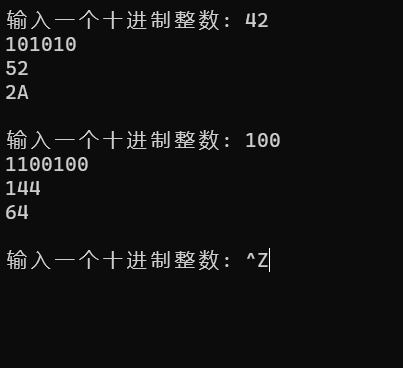#include <stdio.h> #define N 100 void dec2n(int x, int n); // 函数声明 int main() { int x; printf("输入一个十进制整数: "); while(scanf("%d", &x) != EOF) { dec2n(x, 2); // 函数调用: 把x转换成二进制输出 dec2n(x, 8); // 函数调用: 把x转换成八进制输出 dec2n(x, 16); // 函数调用: 把x转换成十六进制输出 printf("\n输入一个十进制整数: "); } return 0; } void dec2n(int x, int n){ char a[N]={'0','1','2','3','4','5','6','7','8','9','A','B','C','D','E','F'}; char b[N]; int count=0; while(x!=0){ b[count++]=a[x%n]; x=x/n; } int i; for(i=count-1;i>=0;--i) printf("%c",b[i]); printf("\n"); }