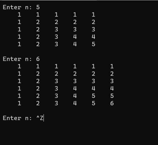 #include <stdio.h> #define N 100 // 函数声明 void func(int x[][N], int n); // 注意:两维数组作为形参的语法 void output(int x[][N], int n); // 注意:两维数组作为形参的语法 int main() { int x[N][N]; int i, j, n; printf("Enter n: "); while(scanf("%d", &n) != EOF) { func(x, n); // 注意:两维数组作为实参的语法 output(x, n); // 注意:两维数组作为实参的语法 printf("\nEnter n: "); } return 0; } // 函数定义 // 功能:输出两维数组x中的数据,数据项n行、n列 void output(int x[][N], int n) { int i, j; for(i = 0; i < n; ++i) { for(j = 0; j < n; ++j) printf("%5d", x[i][j]); printf("\n"); } } void func(int x[][N], int n){ int i,j; for(i=0;i<n;++i) for(j=0;j<n;++j) x[i][j]=i+1; for(i=0;i<n;++i) for(j=0;j<n;++j) x[j][i]=x[i][j]; }
