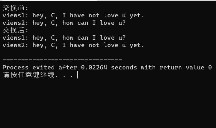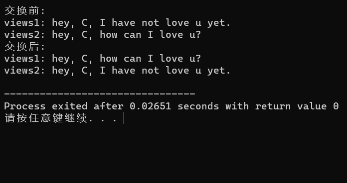 #include <stdio.h> #include <string.h> #define N 80 int main() { char views1[N] = "hey, C, I have not love u yet."; char views2[N] = "hey, C, how can I love u?"; char t[N]; printf("交换前: \n"); printf("views1: %s\n", views1); printf("views2: %s\n", views2); // 交换 strcpy(t, views1); strcpy(views1, views2); strcpy(views2, t); printf("交换后: \n"); printf("views1: %s\n", views1); printf("views2: %s\n", views2); return 0; }
