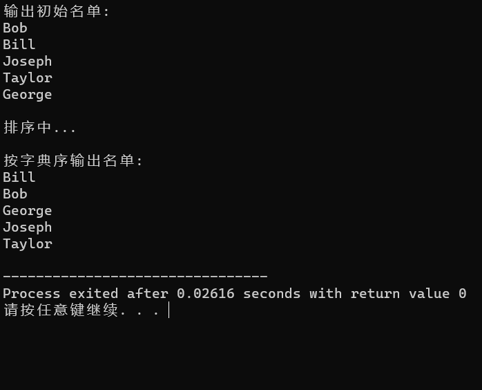 #include <stdio.h> #include <string.h> #define N 5 #define M 20 void bubble_sort(char str[][M], int n); // 函数声明 int main() { char name[][M] = {"Bob", "Bill", "Joseph", "Taylor", "George"}; int i; printf("输出初始名单:\n"); for (i = 0; i < N; i++) printf("%s\n", name[i]); printf("\n排序中...\n"); bubble_sort(name, N); // 函数调用 printf("\n按字典序输出名单:\n"); for (i = 0; i < N; i++) printf("%s\n", name[i]); return 0; } void bubble_sort(char str[][M], int n){ int i,j; char x[100]; for(i=0;i<n-1;++i) for(j=0;j<n-i-1;++j){ if(strcmp(str[j],str[j+1])>0){ strcpy(x,str[j]); strcpy(str[j],str[j+1]); strcpy(str[j+1],x); } } }