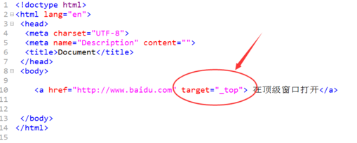 4、target="_top" , 属性作用使得文档载入包含这个超链接的窗口,用 _top 目标将会清除所有被包含的框架并将文档载入整个浏览器窗口。