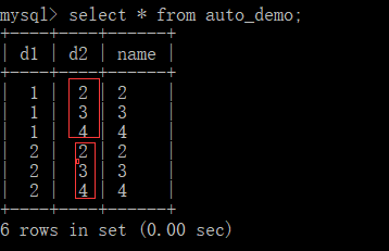 1 create table auto_demo(d1 smallint not null auto_increment,d2 smallint not null,name varchar(10),index(d2,d1))engine=myisam; 2 insert into auto_demo(d2,name) values(2,'2'),(3,'3'),(4, '4'),(2,'2'), (3,'3'), (4,'4');