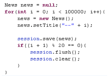 Session 的 save() 及 update() 方法都会把处理的对象存放在自己的缓存中. 假设通过一个 Session 对象来处理大量持久化对象, 应该及时从缓存中清空已经处理完成而且不会再訪问的对象. 详细的做法是在处理完一个对象或小批量对象后, 马上调用 flush() 方法刷新缓存, 然后在调用 clear() 方法清空缓存