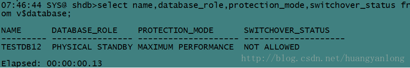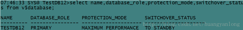 SQL>selectname,database_role,protection_mode,switchover_status from v$database;