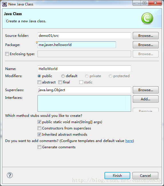 superclass——>父类,这个能够选择的,一般默认都是java.lang.Object的,java里面不论什么一个类都是Object的子类。。