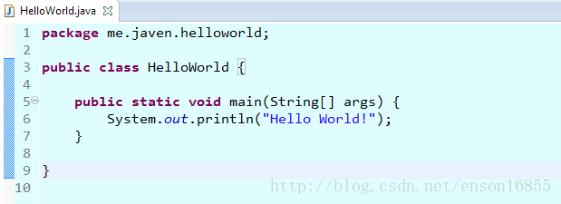 package me.javen.helloworld; public class HelloWorld { public static void main(String[] args) { System.out.println("Hello World!"); } }