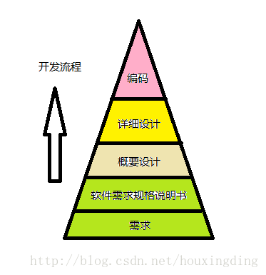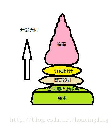 在软件开发中,能够用一个金字塔来形容从需求分析到编码这整个过程。从中来分析整个开发过程以及开发过程中是否规范的利与弊。