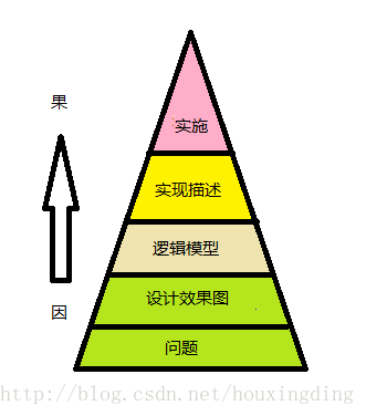 金字塔从下到上依次是由需求分析、概要设计、具体设计、编码组成,这里把需求分析又分成了需求和软件需求规格说明书,如图1所看到的: