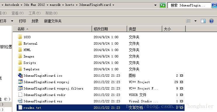 在安装好相应的3ds max, 3ds max sdk,visual studio等软件后,我们就能够開始为3ds max开发导出插件了。首先是打开3ds max sdk下的howto文件夹,依照readme.txt的说明为visual studio添加相应的max导出插件开发向导。