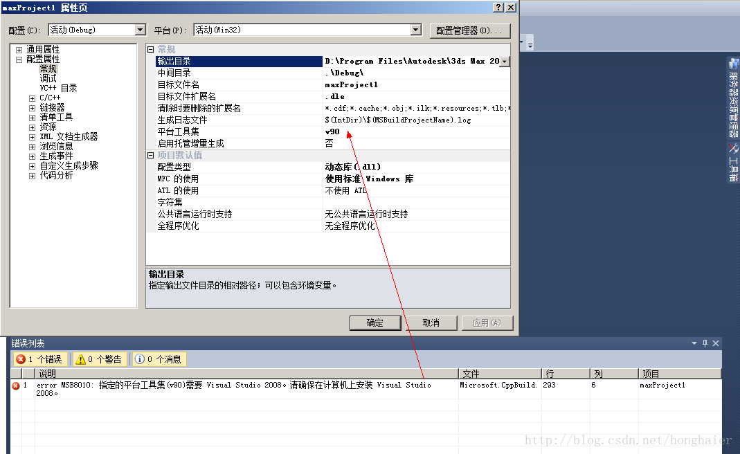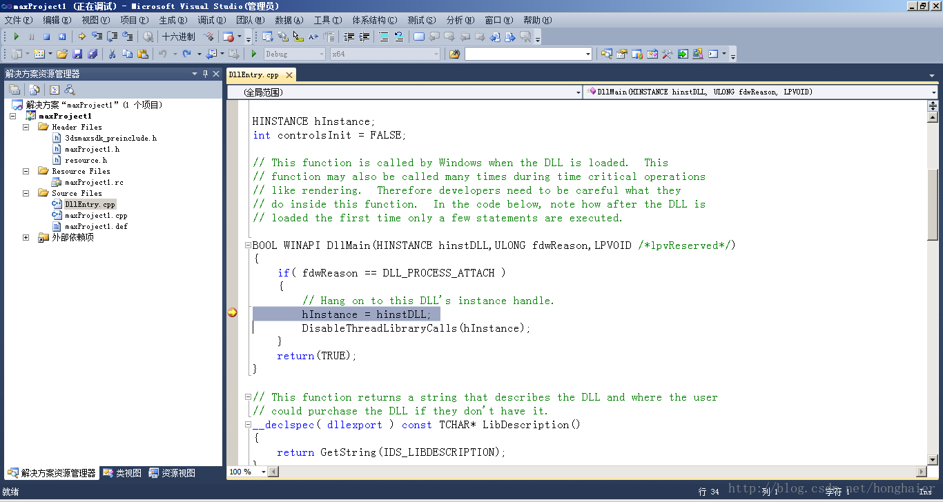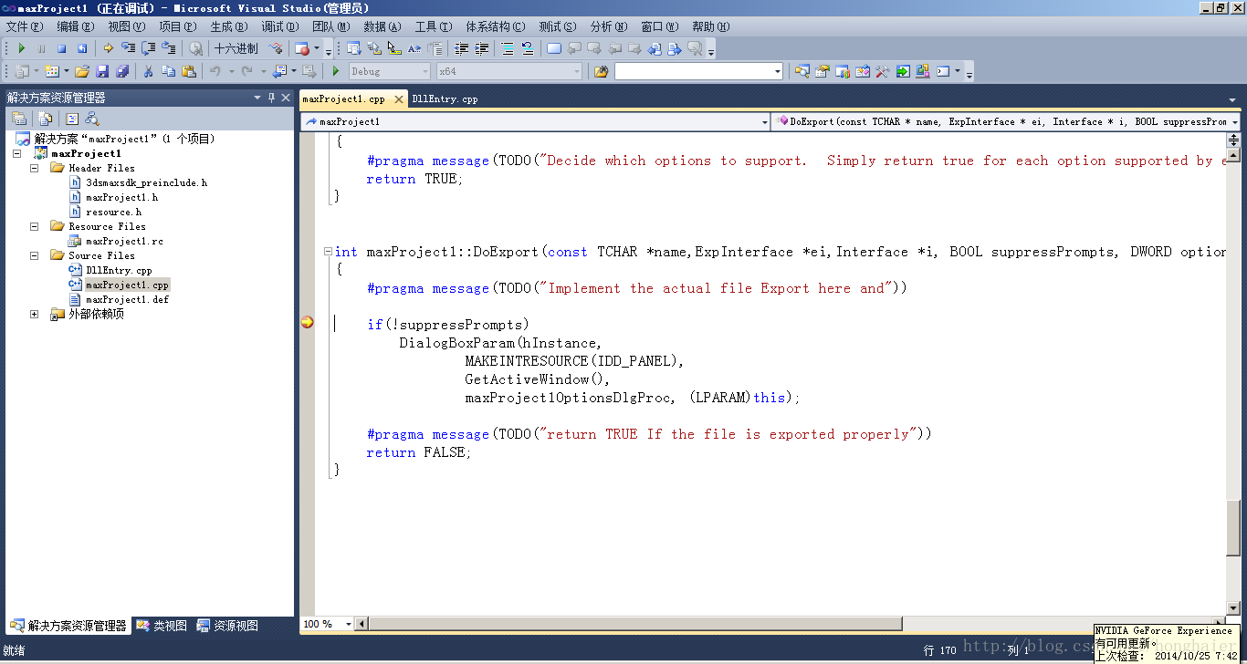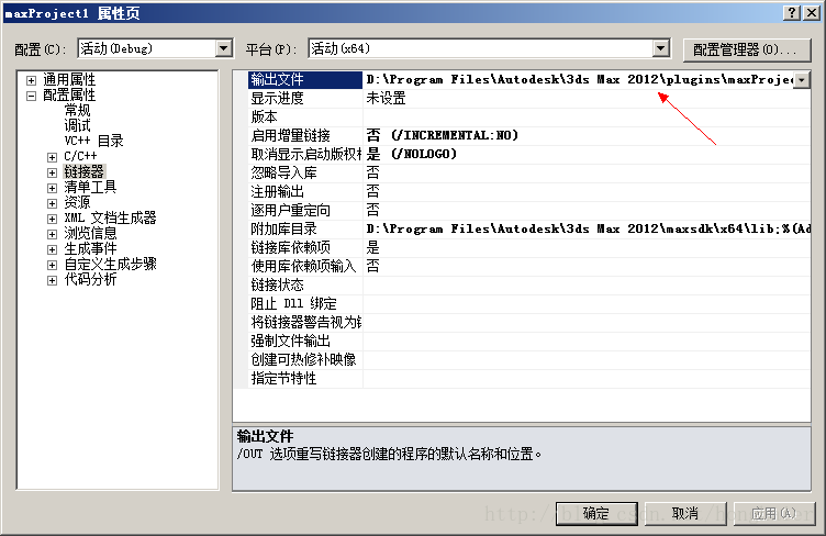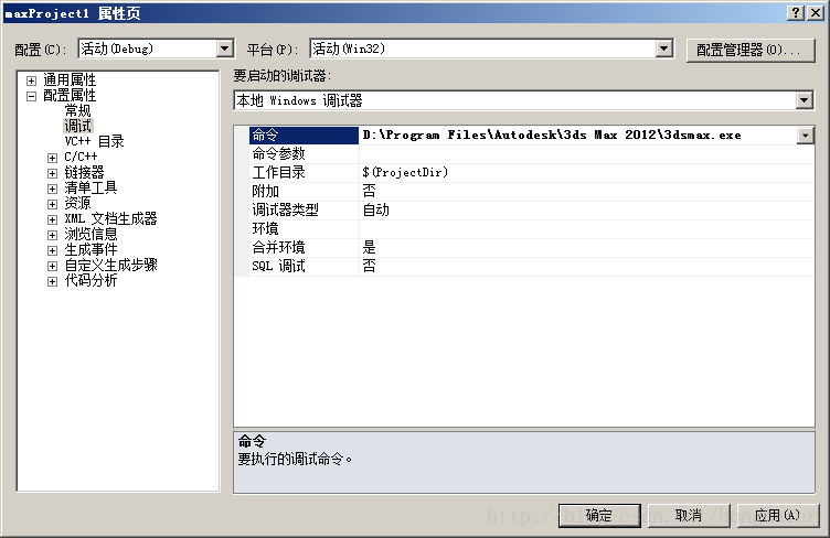 想要调试导出插件,须要设置project->属性->调试->命令设为3ds max的可执行程序路径: