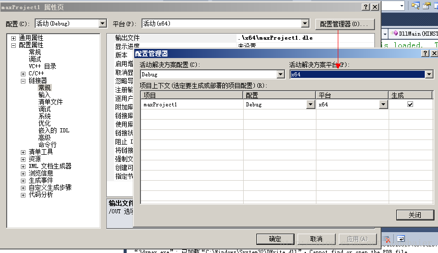这样就能够将咱们调试的导出插件载入到3ds max中,当然,一定一定要确定当前project的配置管理器中平台要与3ds max,操作系统保存一致,假设你的系统是64位的,这里要改成x64,否则启动程序后3ds max会提示“不是有效的win32程序”之类的对话框。