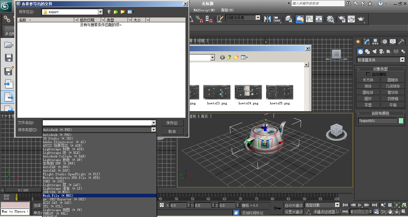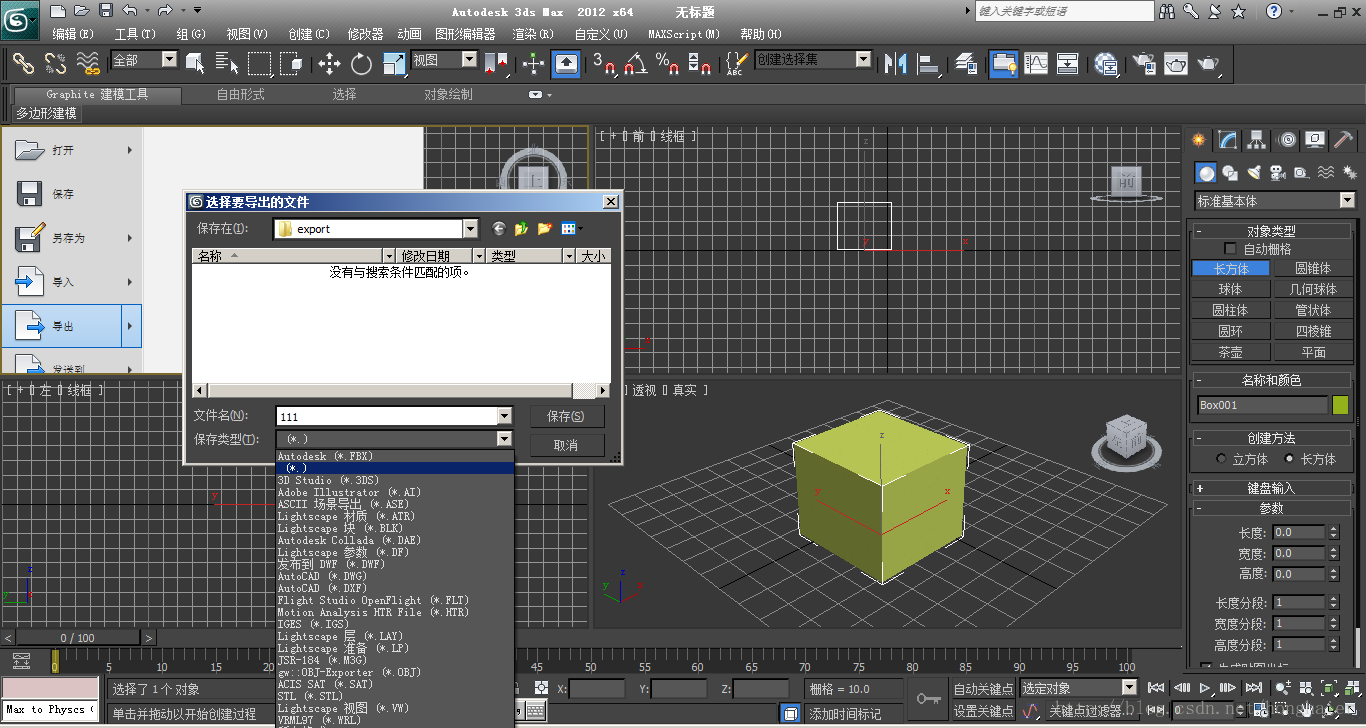 在3ds max 中创建一个立方体,然后在主菜单里选择“导出”,之后在下拉列表中能够看到有一个(*)的奇怪文件格式,那就是我们当前调试中的导出插件所相应的文件格式,由于还没有为导出插件设置导出文件信息,所以默觉得空。