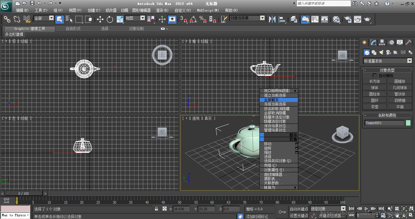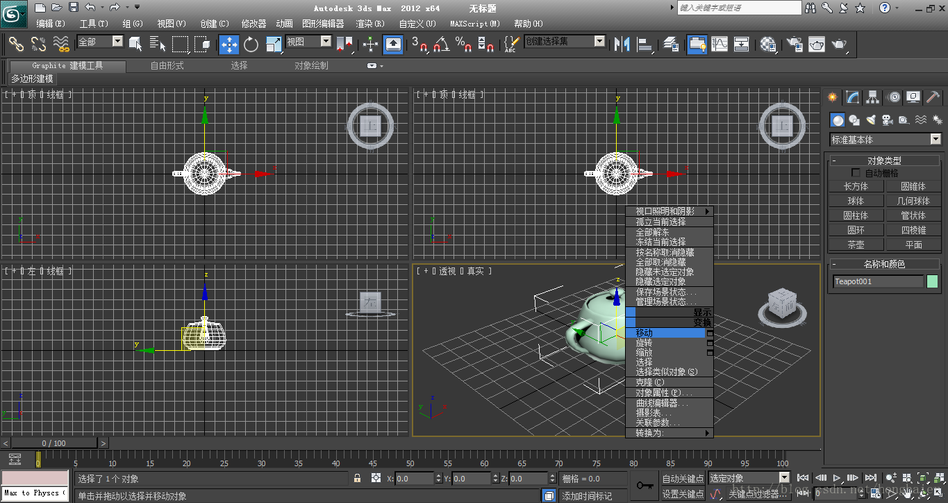 然后我们右键单击,在弹出菜单里选择“所有解冻”和“平移”,在最下部面板的X,Y,Z中将模型置到0,0,0的位置。