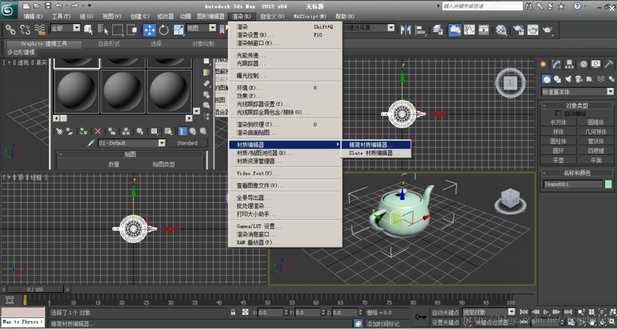 然后我们在菜单上查找“渲染”项,再找其子菜单项“材质编辑器”,选择“精简材质编辑器”。