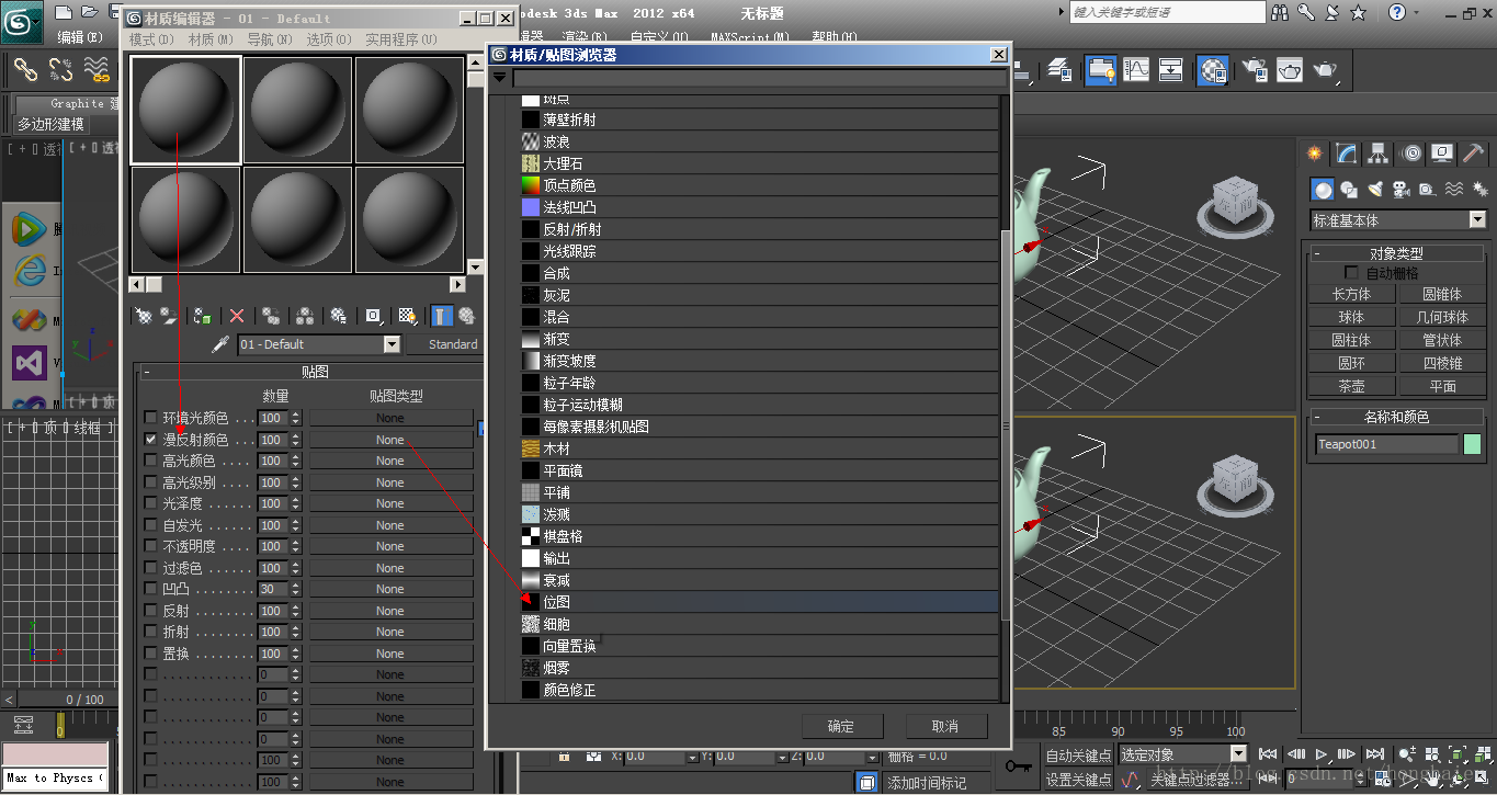 在“精简材质编辑器”对话框中,我们按图示,设置一个贴图。
