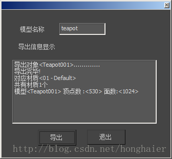 在输入模型名称后,点击“导出”button,能够看到在导出信息显示列表框中,输出了相应的导出信息。完毕后我们点击“退出”关闭对话框,这样,我们就完毕了导出插件部分的编程。