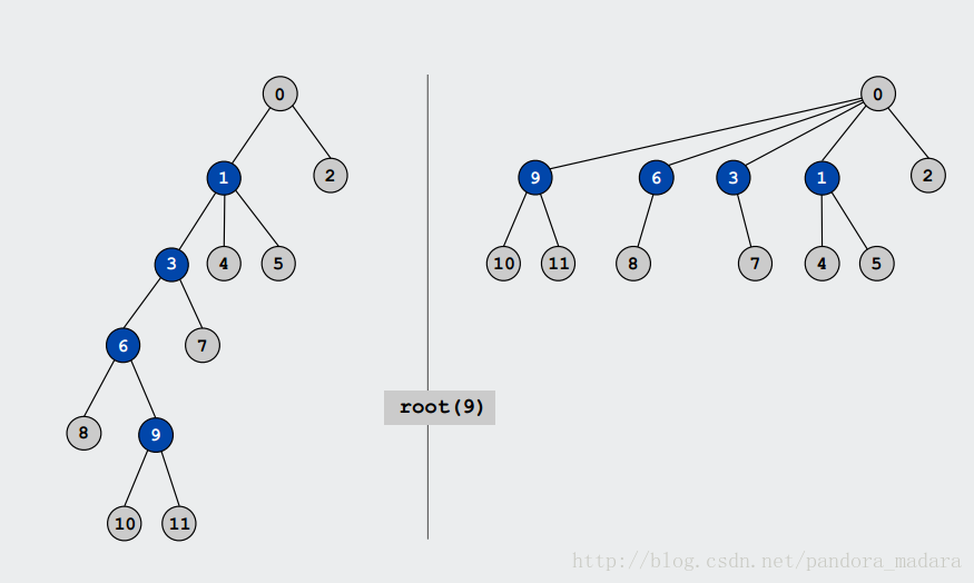 如若找 9 的祖先,则从 9 到 0 的路径上的全部节点拼接到0上面。