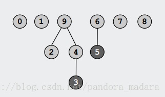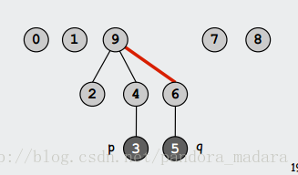 上图,3 的祖先是 9, 5 的祖先是 6,则 3 和 5 不在一个集合中。