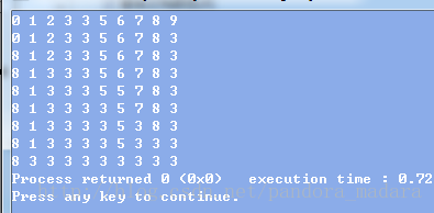 #include <iostream> #include <string.h> using namespace std; #define NODE_SIZE 100 int set_weights[NODE_SIZE]; int parent[NODE_SIZE]; void init(){ for( int i = 0; i < NODE_SIZE; ++i ){ set_weights[i] = 1; parent[i] = i; } } // 寻找改点的祖先 当该点的值 等于 本身的父亲 才是集合的根,返回 int find_ancestor( int i ){ if( i != parent[i] ) parent[i] = find_ancestor( parent[i] ); return parent[i]; } void merge_set( int a, int b ){ int set_a = find_ancestor( a ); int set_b = find_ancestor( b ); if( set_a == set_b ) return; // 将重量小的集合拼接到重量大的集合上 if( set_weights[set_a] >= set_weights[set_b] ){ set_weights[set_a] += set_weights[set_b]; // 更新重量小的集合的根的父亲 parent[set_b] = set_a; } else{ set_weights[set_b] += set_weights[set_a]; parent[set_a] = set_b; } } int main(){ init(); merge_set( 3, 4 ); for( int i = 0; i <= 9; ++i ) cout << parent[i] << " "; cout << endl; merge_set( 4, 9 ); for( int i = 0; i <= 9; ++i ) cout << parent[i] << " "; cout << endl; merge_set( 8, 0 ); for( int i = 0; i <= 9; ++i ) cout << parent[i] << " "; cout << endl; merge_set( 2, 3 ); for( int i = 0; i <= 9; ++i ) cout << parent[i] << " "; cout << endl; merge_set( 5, 6 ); for( int i = 0; i <= 9; ++i ) cout << parent[i] << " "; cout << endl; merge_set( 5, 9 ); for( int i = 0; i <= 9; ++i ) cout << parent[i] << " "; cout << endl; merge_set( 7, 3 ); for( int i = 0; i <= 9; ++i ) cout << parent[i] << " "; cout << endl; merge_set( 4, 8 ); for( int i = 0; i <= 9; ++i ) cout << parent[i] << " "; cout << endl; merge_set( 6, 1 ); for( int i = 0; i <= 9; ++i ) cout << parent[i] << " "; }