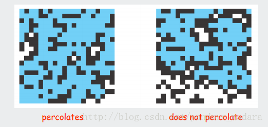 一个非常经典的物理模型, N * N 的格子,每一个格子有两种状态vacant“空白”或者occupied“被占用”,网格能被过滤,当且仅当顶部和底部能被“vacant”状态的格子链接。例如以下,蓝色的是“空白”,白色的是“占用”,则第一幅图是能过滤的,第二幅图是不能被过滤的。