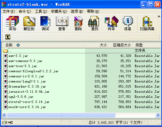 解压刚才下载的压缩包struts-2.3.14-all.zip,在apps文件夹下有个struts2-blank.war包,打开它,到WEB-INF/lib文件夹下,例如以下图所看到的,即为所需的最小包。包括的包应该和详细的Struts版本号有关。