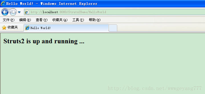 在Tomcat中执行该项目,然后打开浏览器,在地址栏中输入:http://localhost:8080/Struts2Demo/HelloWorld