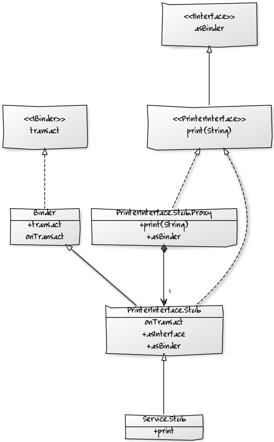 这里面有一个接口,里面在的方法就是AIDL 文件里所定义的方法另一个Stub 这个就是要在Service 端实现的基类,另一个Proxy 它们之间的关系是这种