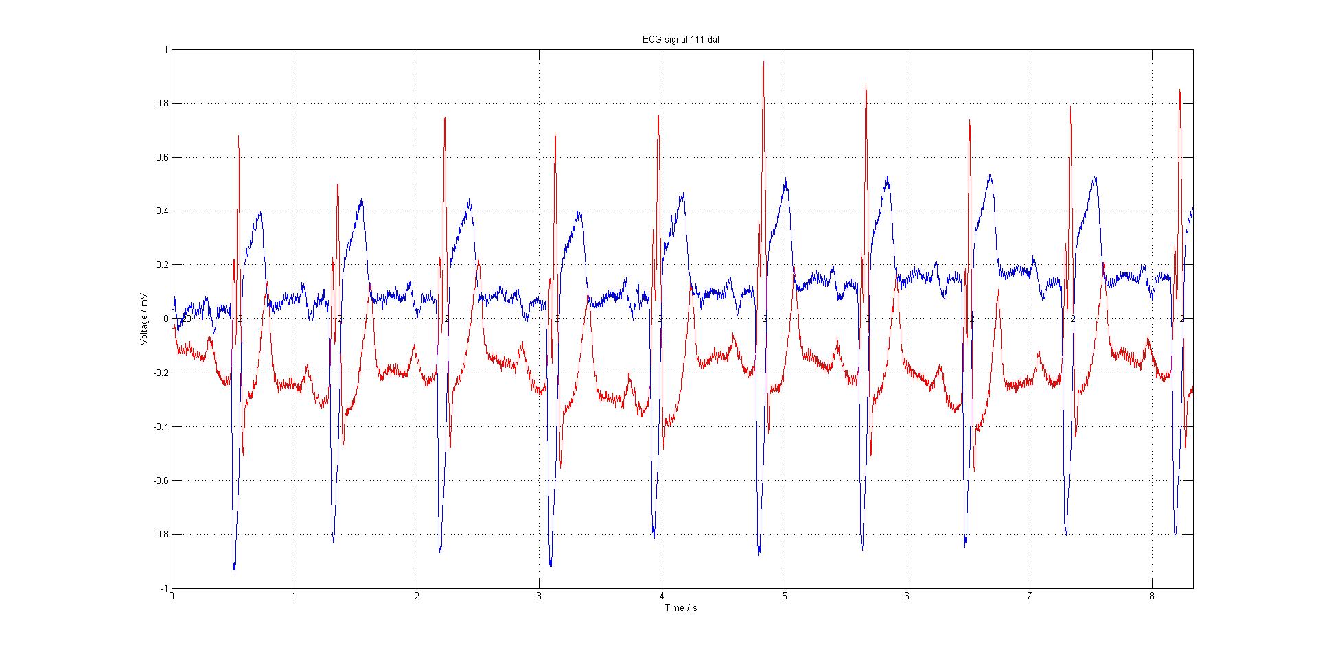 clc; clear all; %------ SPECIFY DATA ------------------------------------------------------ %%选择文件名称 stringname='111'; %选择你要处理的信号点数 points=10000; PATH= 'F:\ECG\MIT-BIH database directory'; % path, where data are saved HEADERFILE= strcat(stringname,'.hea'); % header-file in text format ATRFILE= strcat(stringname,'.atr'); % attributes-file in binary format DATAFILE=strcat(stringname,'.dat'); % data-file SAMPLES2READ=points; % number of samples to be read % in case of more than one signal: % 2*SAMPLES2READ samples are read %------ LOAD HEADER DATA -------------------------------------------------- fprintf(1,'\\n$> WORKING ON %s ...\n', HEADERFILE); signalh= fullfile(PATH, HEADERFILE); fid1=fopen(signalh,'r'); z= fgetl(fid1); A= sscanf(z, '%*s %d %d %d',[1,3]); nosig= A(1); % number of signals sfreq=A(2); % sample rate of data clear A; for k=1:nosig z= fgetl(fid1); A= sscanf(z, '%*s %d %d %d %d %d',[1,5]); dformat(k)= A(1); % format; here only 212 is allowed gain(k)= A(2); % number of integers per mV bitres(k)= A(3); % bitresolution zerovalue(k)= A(4); % integer value of ECG zero point firstvalue(k)= A(5); % first integer value of signal (to test for errors) end; fclose(fid1); clear A; %------ LOAD BINARY DATA -------------------------------------------------- if dformat~= [212,212], error('this script does not apply binary formats different to 212.'); end; signald= fullfile(PATH, DATAFILE); % data in format 212 fid2=fopen(signald,'r'); A= fread(fid2, [3, SAMPLES2READ], 'uint8')'; % matrix with 3 rows, each 8 bits long, = 2*12bit fclose(fid2); M2H= bitshift(A(:,2), -4); M1H= bitand(A(:,2), 15); PRL=bitshift(bitand(A(:,2),8),9); % sign-bit PRR=bitshift(bitand(A(:,2),128),5); % sign-bit M( : , 1)= bitshift(M1H,8)+ A(:,1)-PRL; M( : , 2)= bitshift(M2H,8)+ A(:,3)-PRR; if M(1,:) ~= firstvalue, error('inconsistency in the first bit values'); end; switch nosig case 2 M( : , 1)= (M( : , 1)- zerovalue(1))/gain(1); M( : , 2)= (M( : , 2)- zerovalue(2))/gain(2); TIME=(0:(SAMPLES2READ-1))/sfreq; case 1 M( : , 1)= (M( : , 1)- zerovalue(1)); M( : , 2)= (M( : , 2)- zerovalue(1)); M=M'; M(1)=[]; sM=size(M); sM=sM(2)+1; M(sM)=0; M=M'; M=M/gain(1); TIME=(0:2*(SAMPLES2READ)-1)/sfreq; otherwise % this case did not appear up to now! % here M has to be sorted!!! disp('Sorting algorithm for more than 2 signals not programmed yet!'); end; clear A M1H M2H PRR PRL; fprintf(1,'\\n$> LOADING DATA FINISHED \n'); %------ LOAD ATTRIBUTES DATA ---------------------------------------------- atrd= fullfile(PATH, ATRFILE); % attribute file with annotation data fid3=fopen(atrd,'r'); A= fread(fid3, [2, inf], 'uint8')'; fclose(fid3); ATRTIME=[]; ANNOT=[]; sa=size(A); saa=sa(1); i=1; while i<=saa annoth=bitshift(A(i,2),-2); if annoth==59 ANNOT=[ANNOT;bitshift(A(i+3,2),-2)]; ATRTIME=[ATRTIME;A(i+2,1)+bitshift(A(i+2,2),8)+... bitshift(A(i+1,1),16)+bitshift(A(i+1,2),24)]; i=i+3; elseif annoth==60 % nothing to do! elseif annoth==61 % nothing to do! elseif annoth==62 % nothing to do! elseif annoth==63 hilfe=bitshift(bitand(A(i,2),3),8)+A(i,1); hilfe=hilfe+mod(hilfe,2); i=i+hilfe/2; else ATRTIME=[ATRTIME;bitshift(bitand(A(i,2),3),8)+A(i,1)]; ANNOT=[ANNOT;bitshift(A(i,2),-2)]; end; i=i+1; end; ANNOT(length(ANNOT))=[]; % last line = EOF (=0) ATRTIME(length(ATRTIME))=[]; % last line = EOF clear A; ATRTIME= (cumsum(ATRTIME))/sfreq; ind= find(ATRTIME <= TIME(end)); ATRTIMED= ATRTIME(ind); ANNOT=round(ANNOT); ANNOTD= ANNOT(ind); %------ DISPLAY DATA ------------------------------------------------------ figure(1); clf, box on, hold on ;grid on ; plot(TIME, M(:,1),'r'); if nosig==2 plot(TIME, M(:,2),'b'); end; for k=1:length(ATRTIMED) text(ATRTIMED(k),0,num2str(ANNOTD(k))); end; xlim([TIME(1), TIME(end)]); xlabel('Time / s'); ylabel('Voltage / mV'); string=['ECG signal ',DATAFILE]; title(string); fprintf(1,'\\n$> DISPLAYING DATA FINISHED \n'); % ------------------------------------------------------------------------- fprintf(1,'\\n$> ALL FINISHED \n');