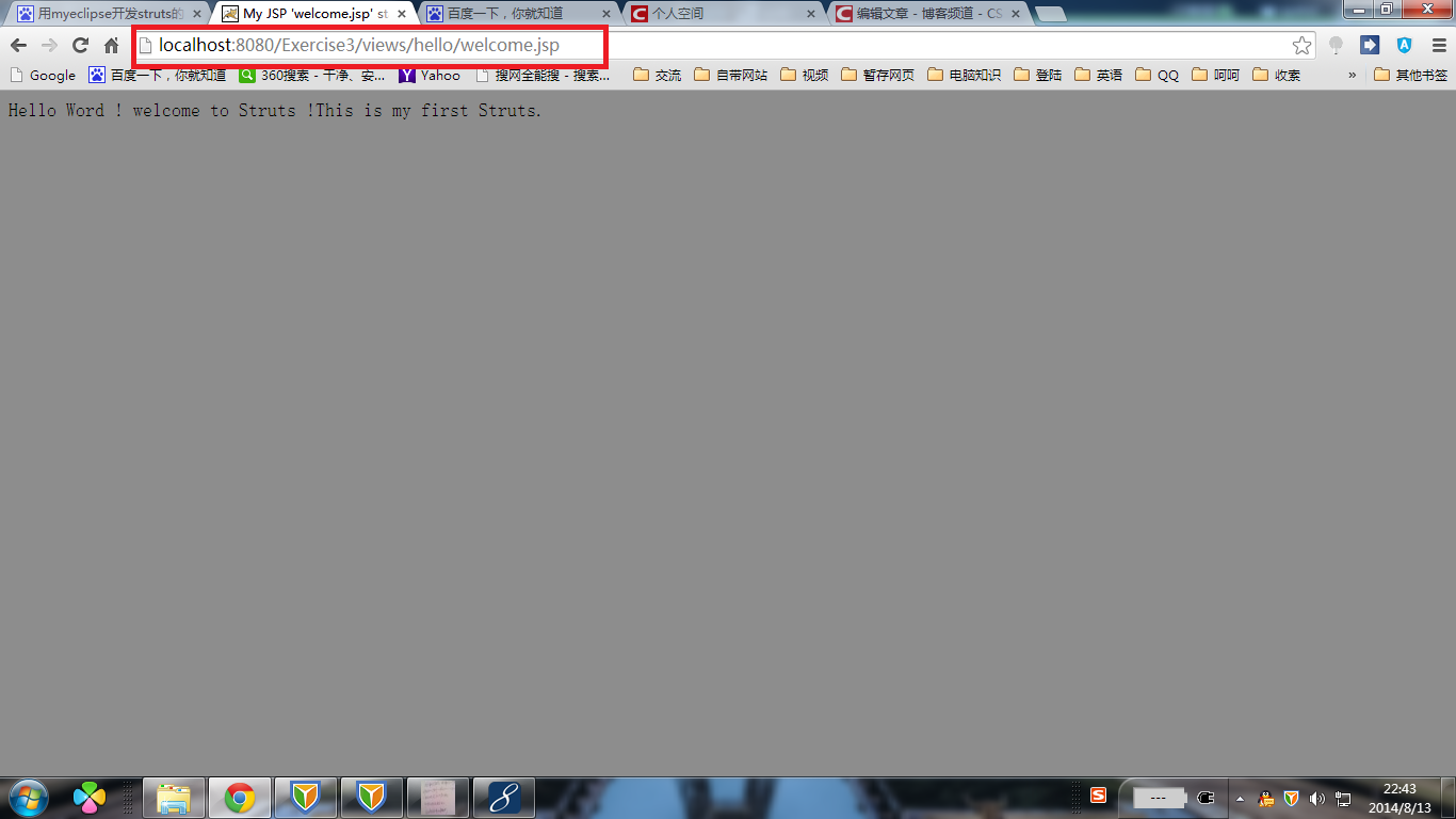 在浏览器中输入:http://localhost:8080/Exercise3/test/hello.action