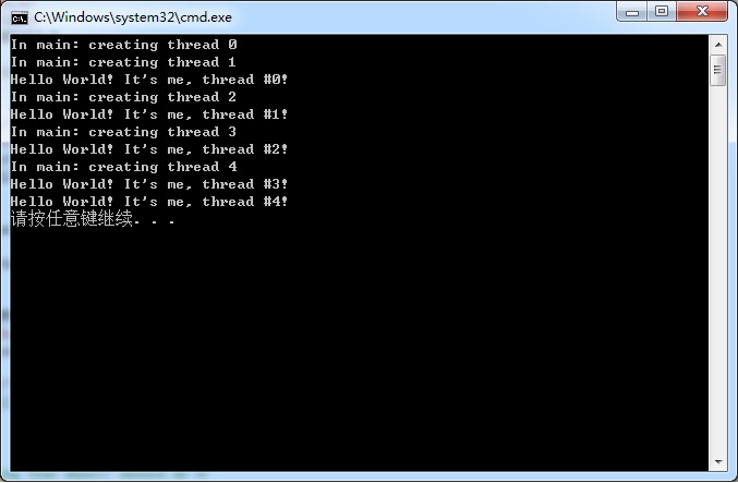 本程序创建了5个线程。分别输出Hello World!以及线程编号。