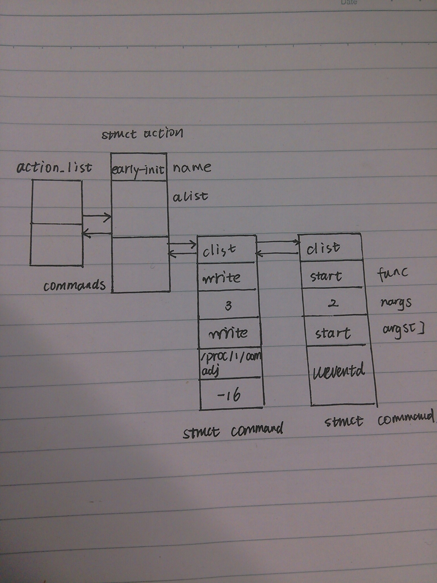 会调用parse_line_action函数来解析write /proc/1/oom_adn -16,传入的參数中nargs=3,而cmd结构体中的args就是用来保存write /proc/1/oom_adj -16的。我们来看下,当解析完成上面section时的组织结构。