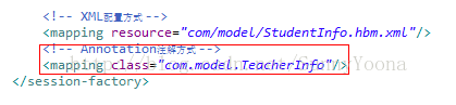 <?xml version="1.0"?> <!DOCTYPE hibernate-mapping PUBLIC "-//Hibernate/Hibernate Mapping DTD 3.0//EN" "http://hibernate.sourceforge.net/hibernate-mapping-3.0.dtd"> <hibernate-mapping> <class name="com.model.StudentInfo" table="StudentInfo"> <id name="id" column="ID"> <generator class="native"/> </id> <property name="name" column = "Name"/> <property name="age" column = "Age"/> <property name="sex" column = "Sex"/> </class> </hibernate-mapping>