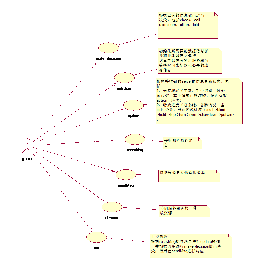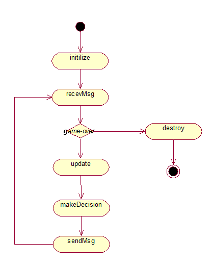 client先通过initialize和server建立连接,并注冊,然后调用recevMsg開始接收消息。解析消息,假设接收到了游戏结束game-over的报文,则调用destroy断开连接释放资源,整个流程结束。否则依据接收到的报文,解析里面的信息。然后依据须要调用Update更新游戏和玩家的状态。假设server要求client做出决策动作,则调用makeDecision依据当前收集的信息进行决策。然后把决策动作交由sendMsg返回给server,等待server的下一条报文信息,整个client游戏如此不断循环,直到游戏结束。