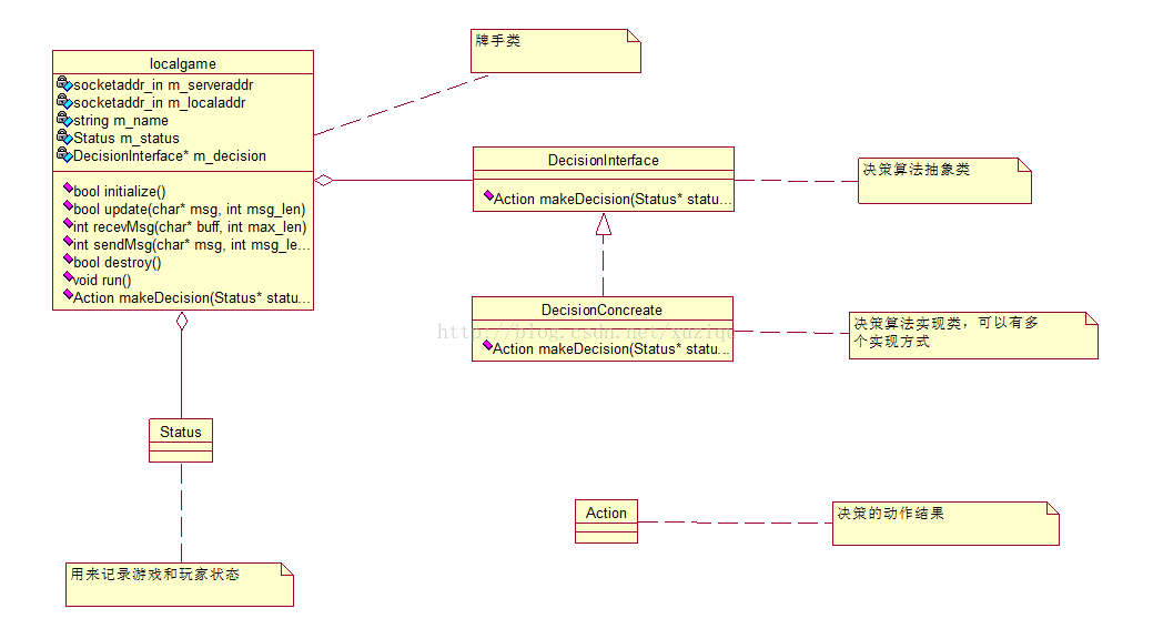在设计中,依据用例图对模块功能进行了划分并封装。最后得到了上图的几个类。因为设计初期,我们还不能确认在决策算法中须要什么数据信息,所以,在Status类中仅仅是保留了接口和引用关系,里面详细的成员变量和函数则须要和详细的实现需求结合然后加以扩充,Action类的情况也是类似的。