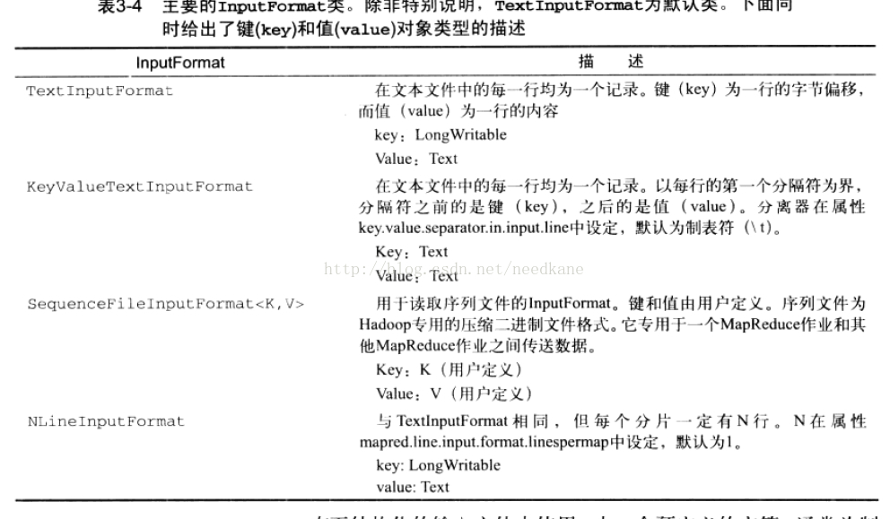 hadoop切割与读取输入文件的方式被定义在InputFormat接口的一个实现中。TextInputFormat是默认的实现,当你想要一次获取一行内容作为输入数据时又没有确定的键。从TextInputFormat返回的键为每行的字节偏移量,但眼下没看到用过