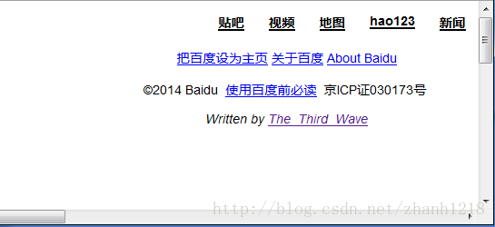 <!DOCTYPE html> <html lang="en"> <head> <meta charset="utf-8"> <link rel="stylesheet" type="text/css" href="css/main.css"> <title>百度一下,你就知道</title> <script> function myFunc() { var winHeight=window.innerHeight || document.documentElement.clientHeight || document.body.clientHeight; if (parseInt(winHeight)<750){ document.getElementById("footer").setAttribute("class", "dAdjustTop"); /*document.getElementById("inputtext").value=winHeight+" "+document.getElementById("footer").getAttribute("class");*/ } else { document.getElementById("footer").setAttribute("class", "dAdjustButtom"); /*document.getElementById("inputtext").value=winHeight+" "+document.getElementById("footer").getAttribute("class");*/ } } </script> </head> <body onload="myFunc() "onresize="myFunc()"> <nav> <a href="http://news.baidu.com" target="_blank">新闻</a> <a href="http://www.hao123.com" target="_blank">hao123</a> <a href="http://map.baidu.com" target="_blank">地图</a> <a href="http://v.baidu.com" target="_blank">视频</a> <a href="http://tieba.baidu.com" target="_blank">贴吧</a> </nav> <div id="mid"> <div id="logo"> <!--<img hidefocus="true" src="http://www.baidu.com/img/bd_logo1.png">--> <img src="images/bd_logo1.png"> </div> <div id="input"> <input id="inputtext" value="" maxlength="100" autocomplete="off"> <input id="button" type="submit" value="百度一下"> </div> </div> <footer id="footer"> <p> <a href="http://www.baidu.com/cache/sethelp/index.html" target="_blank">把百度设为主页</a> <a href="http://home.baidu.com">关于百度</a> <a href="http://ir.baidu.com">About Baidu</a> </p> <p> ©2014 Baidu <a href="/duty/" name="tj_duty">使用百度前必读</a> 京ICP证030173号 </p> <address> Written by <a href="http://blog.csdn.net/zhanh1218">The_Third_Wave</a> </address> </footer> </body> </html>CSS为
