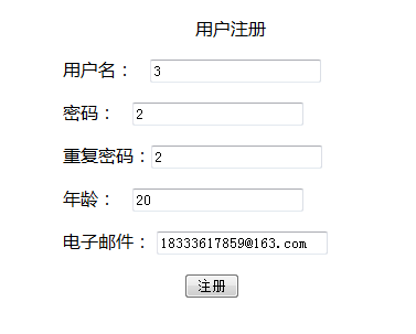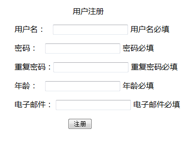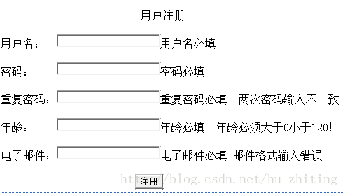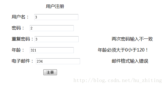 <%@ Page Language="C#" AutoEventWireup="true" CodeFile="Default.aspx.cs" Inherits="_Default" %> <!DOCTYPE html> <html xmlns="http://www.w3.org/1999/xhtml"> <head runat="server"> <meta http-equiv="Content-Type" content="text/html; charset=utf-8"/> <title></title> </head> <body> <form id="form1" runat="server"> <div> </div> <p style="margin-left: 200px"> 用户注冊</p> <p> <asp:Label ID="Label2" runat="server" Text="username:"></asp:Label> <asp:TextBox ID="TextBox6" runat="server"></asp:TextBox> <asp:RequiredFieldValidator ID="RequiredFieldValidator6" runat="server" ControlToValidate="TextBox6" ErrorMessage="username必填"></asp:RequiredFieldValidator> </p> <p> password: <asp:TextBox ID="TextBox2" runat="server"></asp:TextBox> <asp:RequiredFieldValidator ID="RequiredFieldValidator2" runat="server" ControlToValidate="TextBox2" ErrorMessage="password必填"></asp:RequiredFieldValidator> </p> <p> 反复password:<asp:TextBox ID="TextBox3" runat="server"></asp:TextBox> <asp:RequiredFieldValidator ID="RequiredFieldValidator3" runat="server" ControlToValidate="TextBox3" ErrorMessage="反复password必填"></asp:RequiredFieldValidator> <asp:CompareValidator ID="CompareValidator1" runat="server" ControlToCompare="TextBox2" ControlToValidate="TextBox3" ErrorMessage="两次password输入不一致"></asp:CompareValidator> </p> <p> 年龄: <asp:TextBox ID="TextBox4" runat="server"></asp:TextBox> <asp:RequiredFieldValidator ID="RequiredFieldValidator4" runat="server" ControlToValidate="TextBox4" ErrorMessage="年龄必填"></asp:RequiredFieldValidator> <asp:RangeValidator ID="RangeValidator1" runat="server" ControlToValidate="TextBox4" ErrorMessage="年龄必须大于0小于120!" MaximumValue="120" MinimumValue="1" Type="Integer"></asp:RangeValidator> </p> <p> <asp:Label ID="Label1" runat="server" Text="电子邮件:"></asp:Label> <asp:TextBox ID="TextBox5" runat="server"></asp:TextBox> <asp:RequiredFieldValidator ID="RequiredFieldValidator5" runat="server" ControlToValidate="TextBox5" ErrorMessage="电子邮件必填"></asp:RequiredFieldValidator> <asp:RegularExpressionValidator ID="RegularExpressionValidator1" runat="server" ControlToValidate="TextBox5" ErrorMessage="邮件格式输入错误" ValidationExpression="\w+([-+.']\w+)*@\w+([-.]\w+)*\.\w+([-.]\w+)*"></asp:RegularExpressionValidator> </p> <p> <asp:Button ID="Button1" runat="server" Text="注冊" /> </p> </form> </body> </html>
