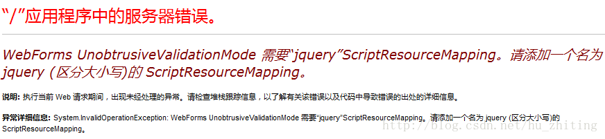 非经常见的一个错误。在网上搜了搜非常快就得到了答案,那是由于WebForm使用UnobtrusiveValidationMode来验证。所以能够设定不要使用UnobtrusiveValidationMode。例如以下,在Page_Load中设定,