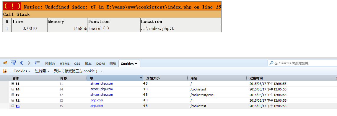 这时候就看到了 t7 说明在上一级的index.php 中cookie设置生效了仅仅只是仅仅有在对应的path下才干获取到